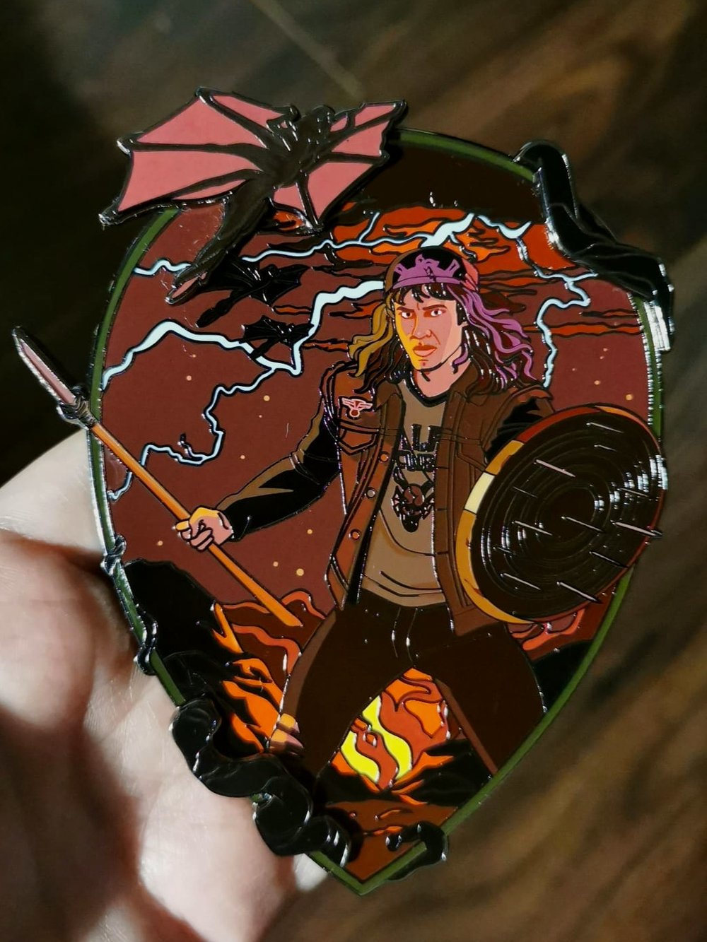 Of course, we had to do a variant pin that embodies 'The "Eddie Munson Kas Theory". Fans believe that Vecna could resurrect Eddie as a puppet, only for Eddie to eventually turn on and kill his master, mirroring Kas's the Bloody-Handed's story arc in DnD.