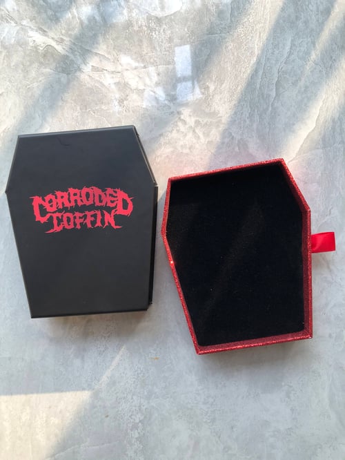 Each pin comes with Eddie's guitar pick necklace, a coffin box, a laser cut backing card, a sticker of the pin design and a print in collaboration with @majorwavecreative on Instagram.